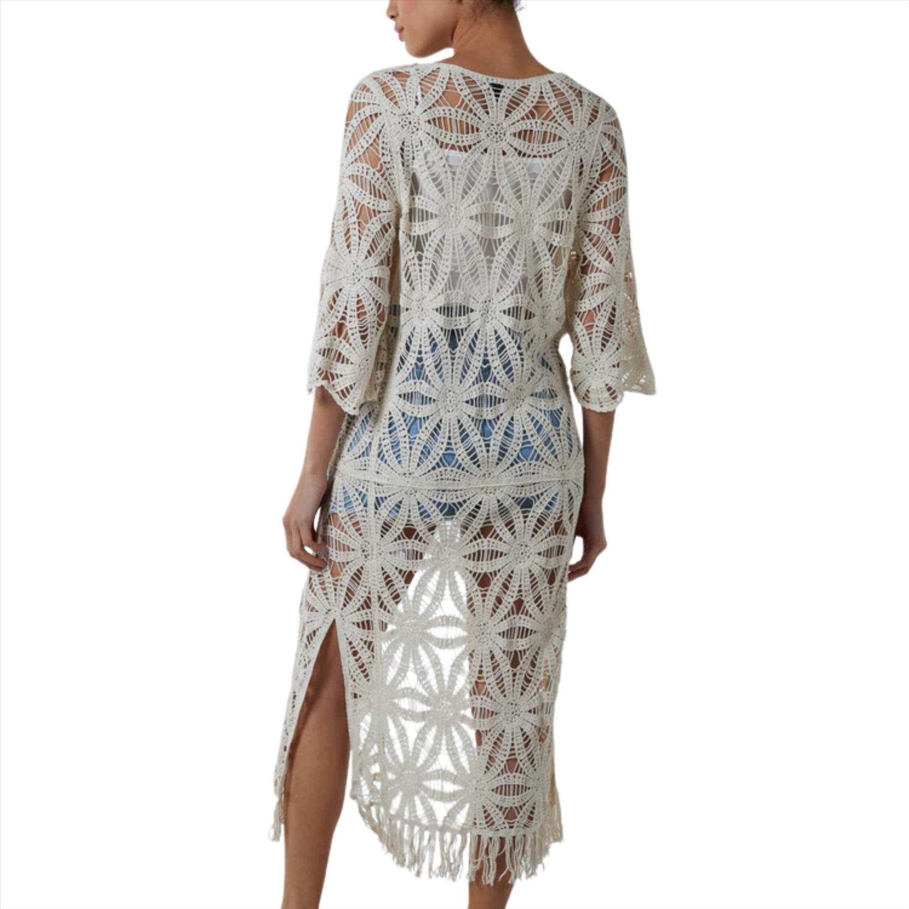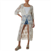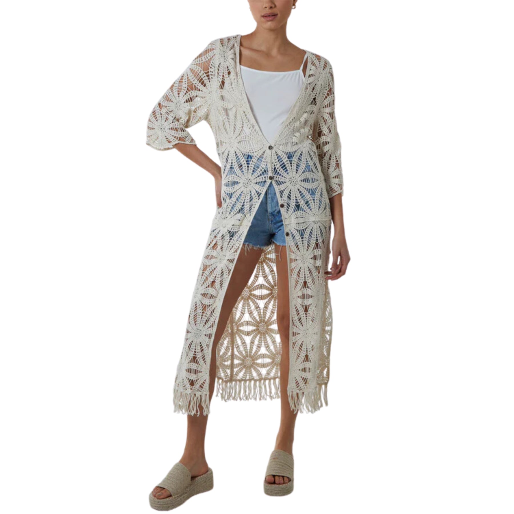Explore the hottest fashion trend for 2024 with our range of crochet clothing.  This maxi length crochet kimono cardigan is crafted from comfortable and lightweight cotton. It features a gorgeous crochet design with a delicate floral pattern, on-trend tassel detail, button-up front and 3/4 sleeves. Elevate your holiday outfit with this versatile cardigan today.