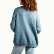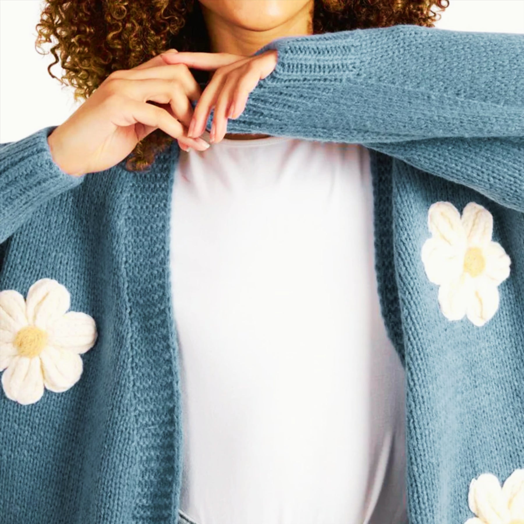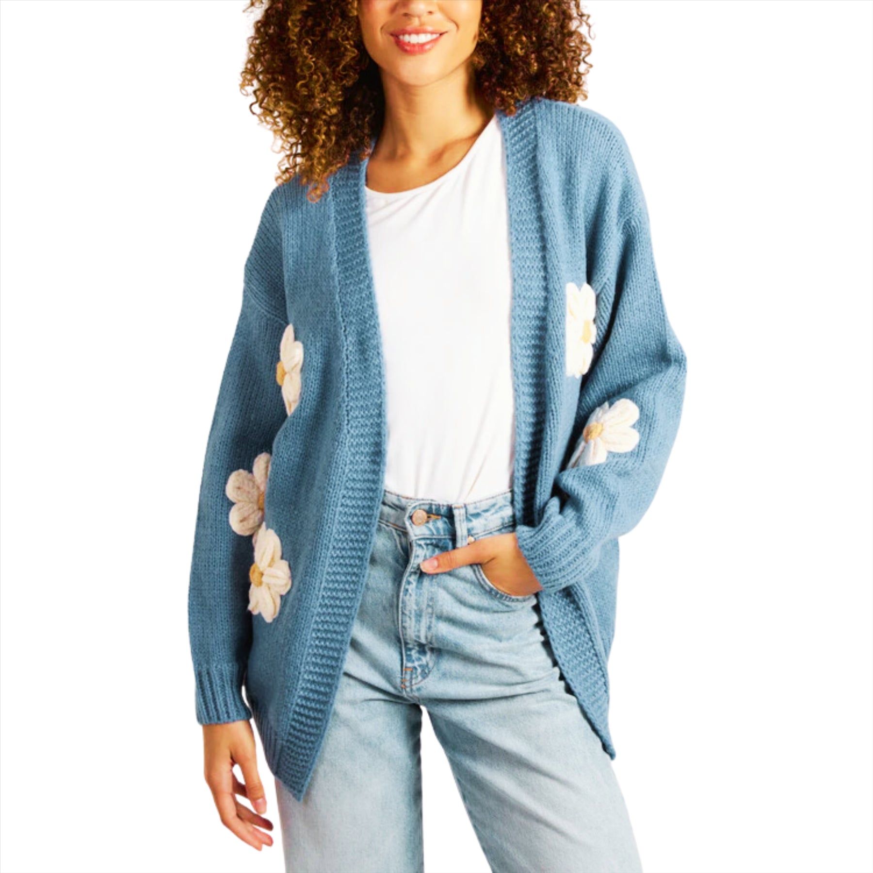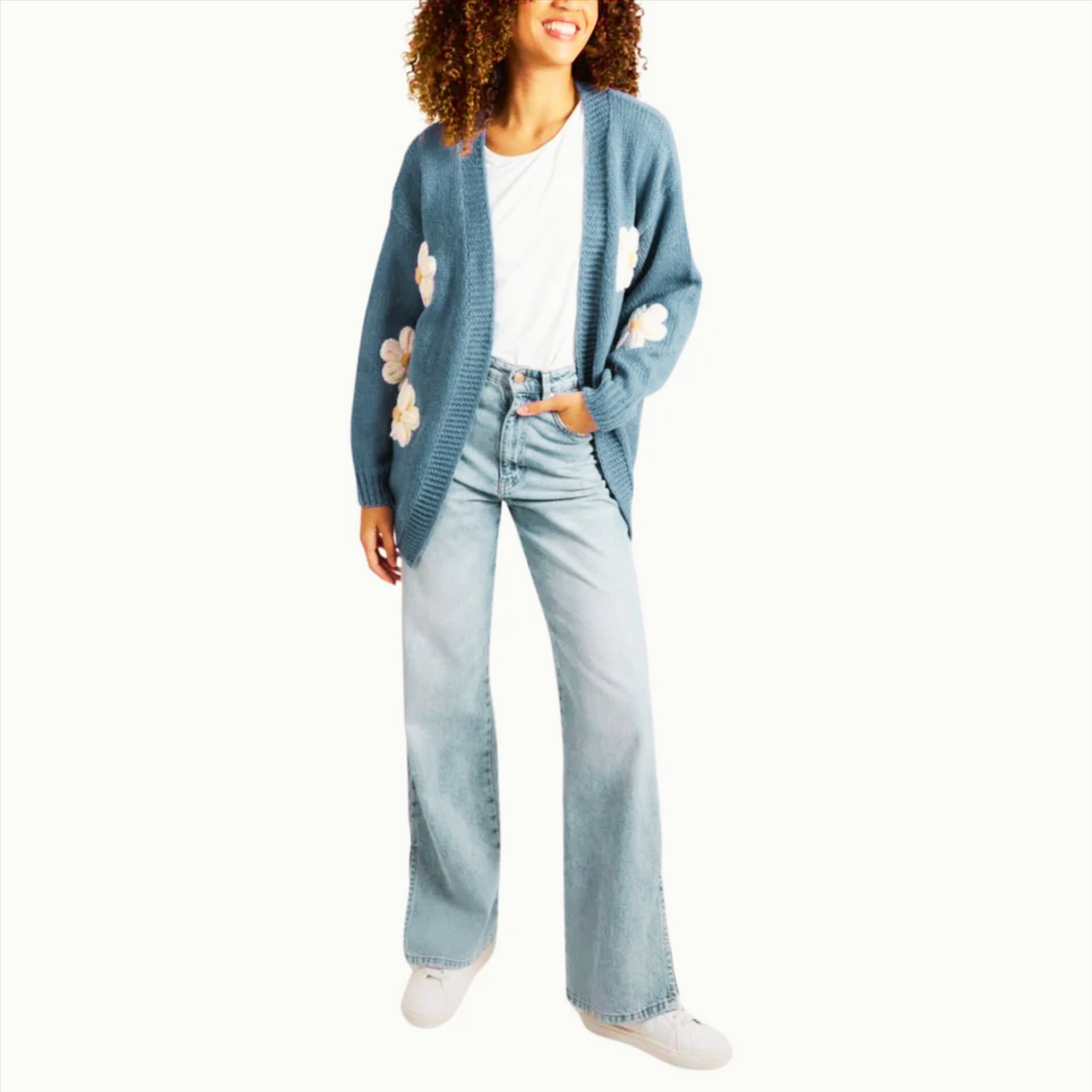 This gorgeous cardigan is a customer favourite! A statement piece, the beautiful denim-blue catches the eye whilst the delicate hand knitted daisies elevate this cardigan to a higher level. It has an elegant open design which makes it perfect for layering. Made from a cosy knit, this cardigan is both stylish and relaxed. Pop over a white t-shirt and jeans and you're good to go.