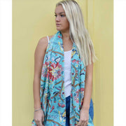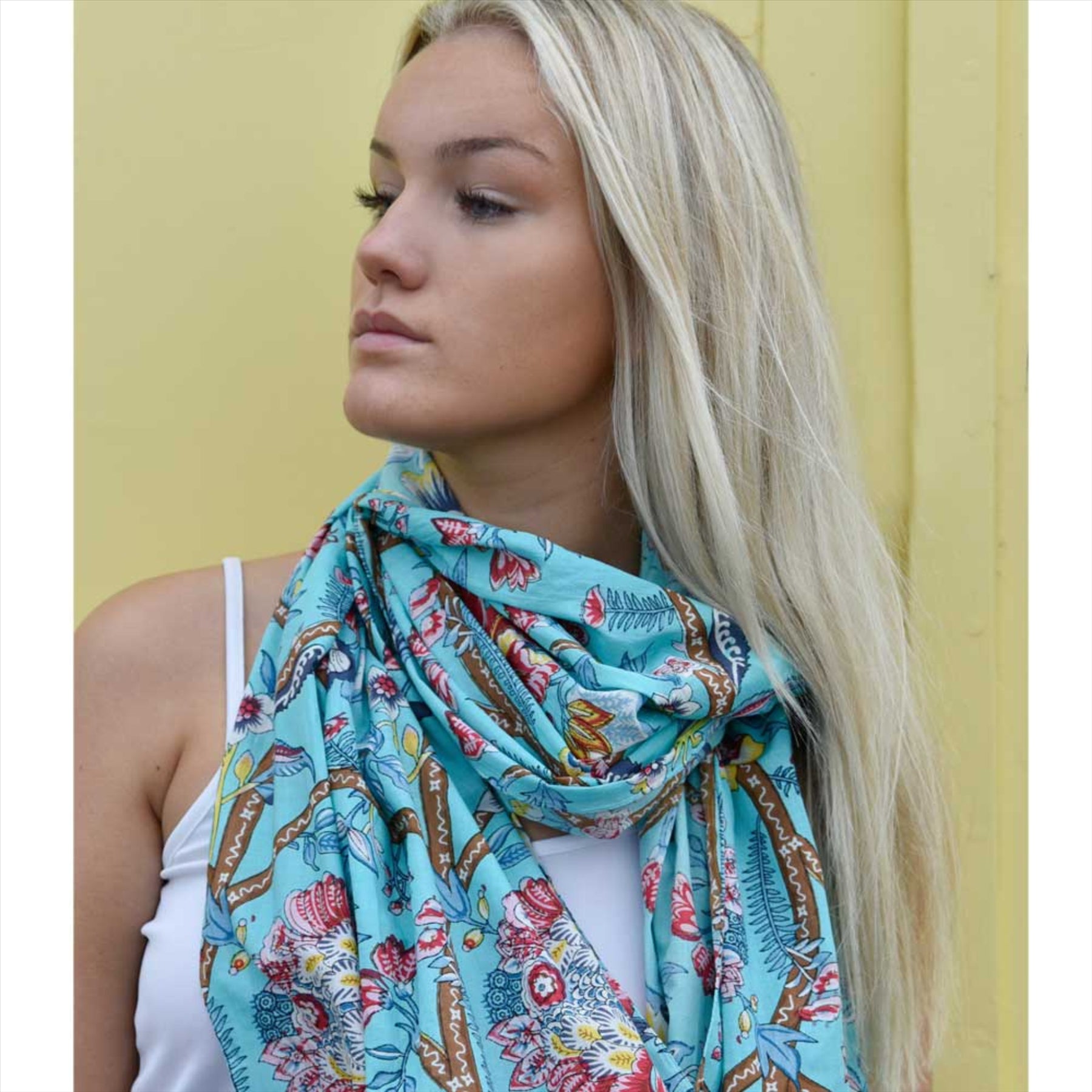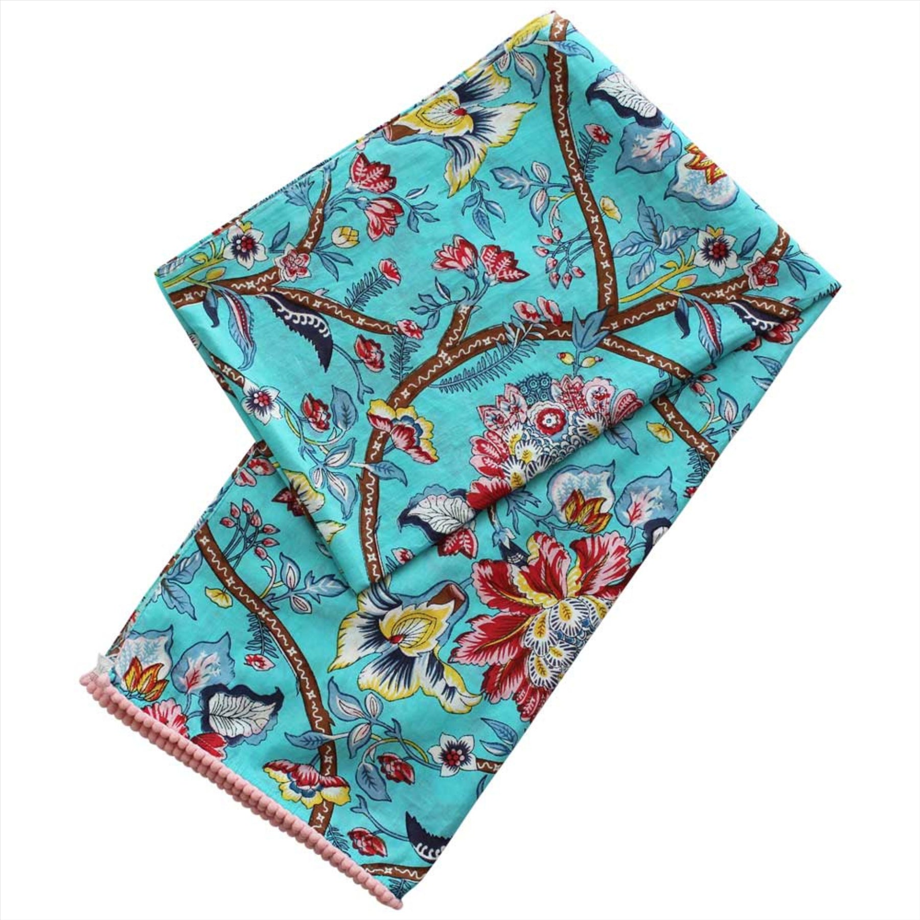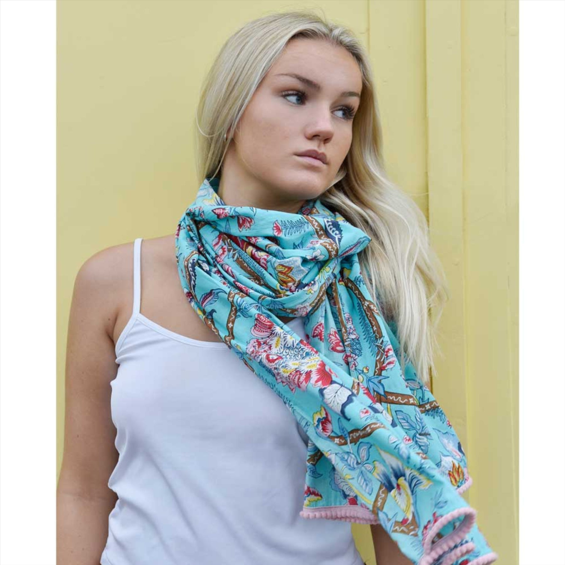 This gorgeous scarf has a beautiful floral print with all the tropical vibes. A turquoise blue background is the perfect backdrop for a medley of exotic flowers. Colourful large blooms, orchids, buds, and leaves are illustrated with abstract squiggles and an assortment of leaf shapes. The scarf is edged with a pink pom-pom trim to compliment the print. This gorgeous scarf is 100% cotton and luxuriously long – 180 x 50cm, long enough to drape and tie in lots of different stylish ways.